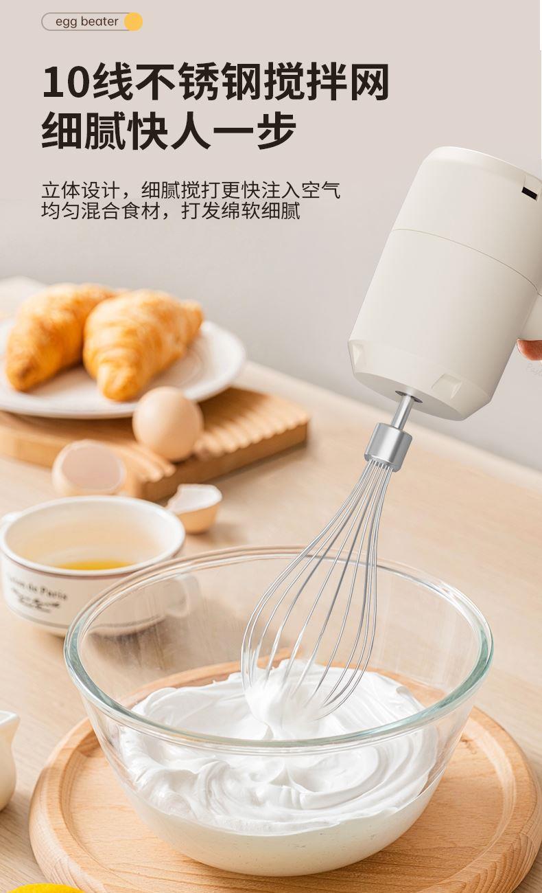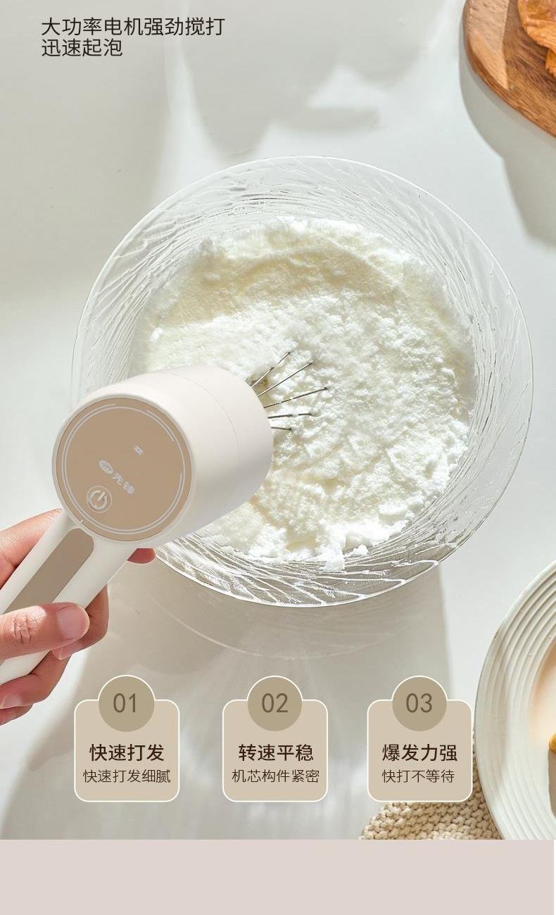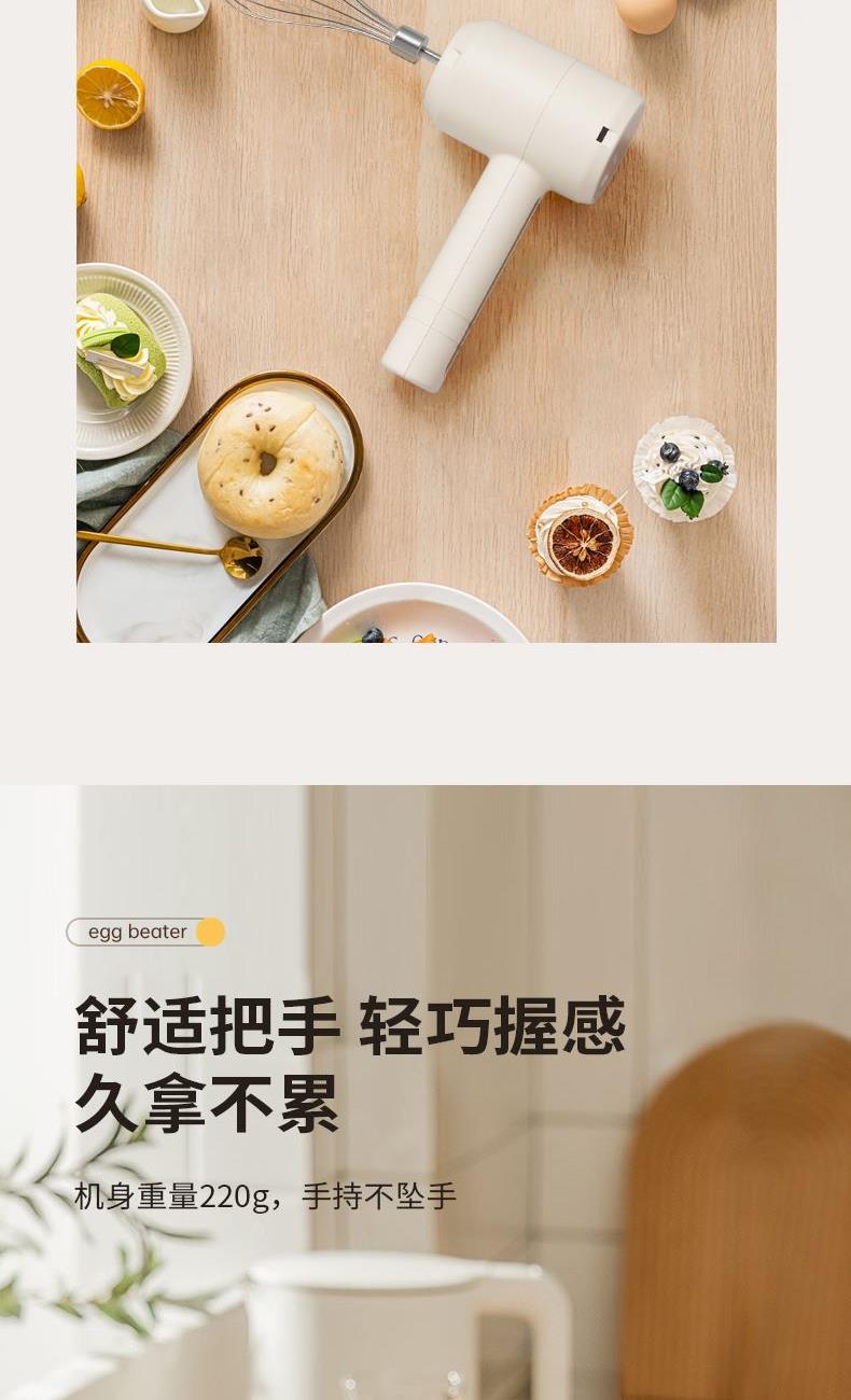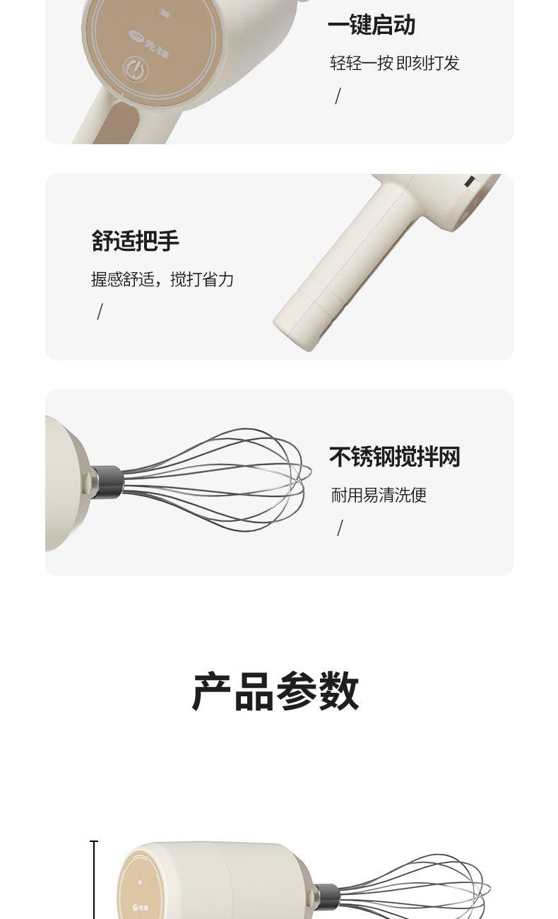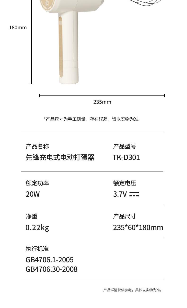 彩包尺寸:210*106*73mm 外箱尺寸:440*393*558mm 单台毛重:0.26kg 单台净重:0.22kg 额定电压:3.7V 额定功率:20W 产品条码:6977197070342 包装材料:彩盒+大外箱 产品尺寸:235*60*180mm 轻松打发的乐趣省去繁琐程序,不占空间纤细身形好收纳,一键开机即刻打发,大动力电机快速打发没难度