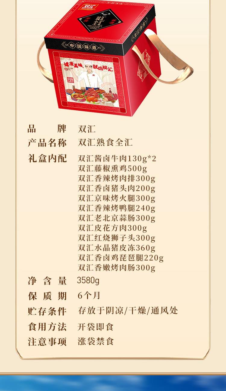 双汇酱卤牛肉130g 双汇酱卤牛肉130g 双汇藤椒熏鸡500g 双汇香辣烤肉排300g 双汇香卤猪头肉200g 双汇京味烤火腿300g 双汇香辣烤鸭腿240g 双汇老北京蒜肠300g 双汇碗装红烧肉300g 双汇红烧狮子头300g 双汇水晶猪皮冻360g 双汇香卤鸡琵琶腿220g 双汇香嫩烤肉肠300g