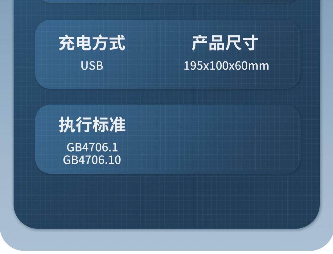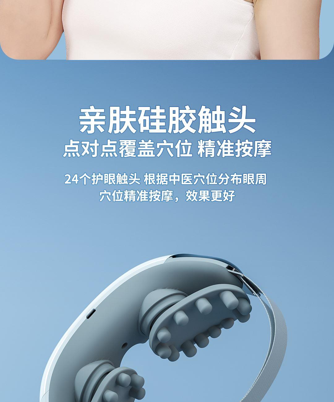 包装尺寸:244*72*154mm 外箱尺寸:510*385*645mm 单台毛重:0.61Kg 包装材料:彩包 额定电压:3.7V 额定功率:5W 产品条码:6923473114309 3种不同场景应用 | 24颗硅胶触点,360度均衡揉压 | 可清洗的按摩头,像果冻一样柔软 | 语音向导,感受人工智能魅力 | 大屏按键一目了然。