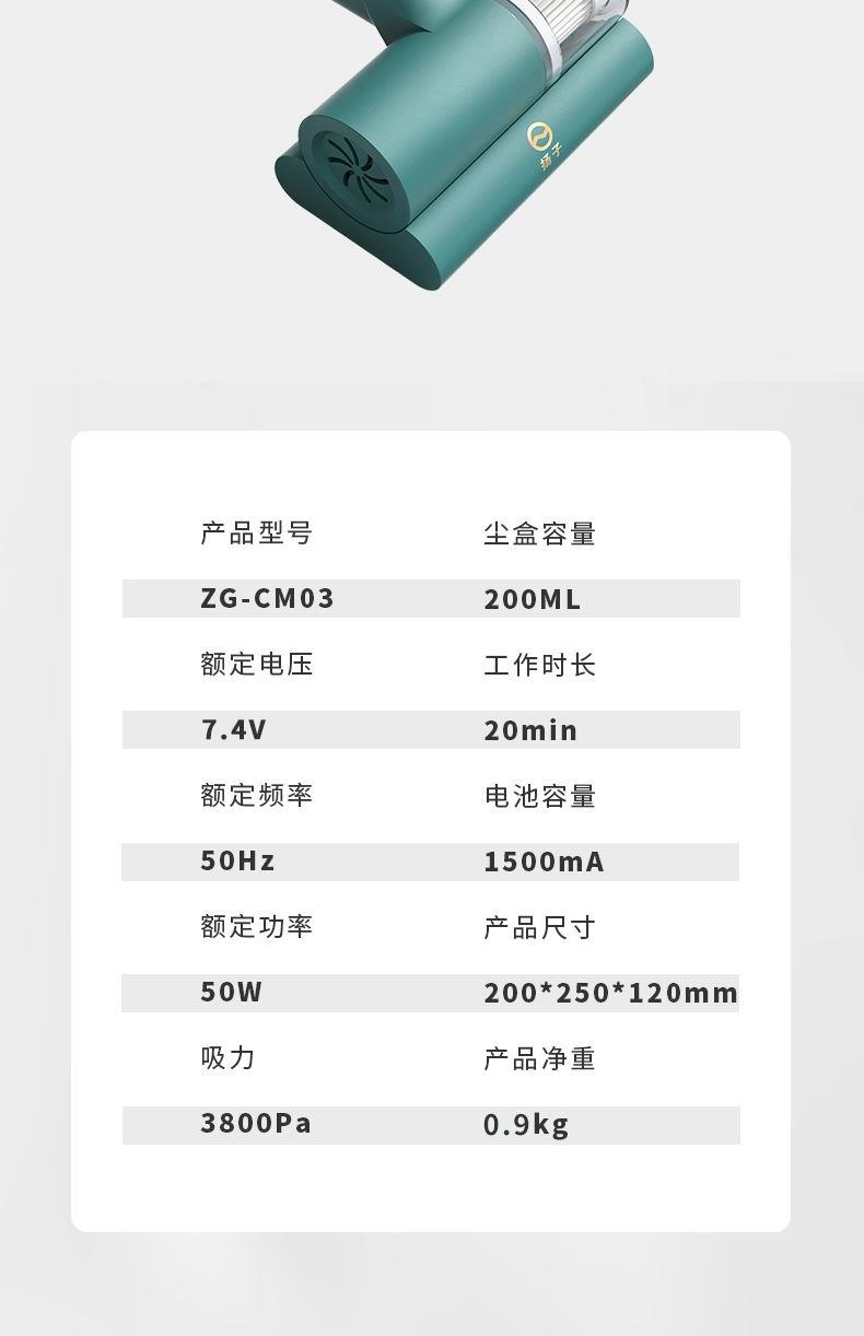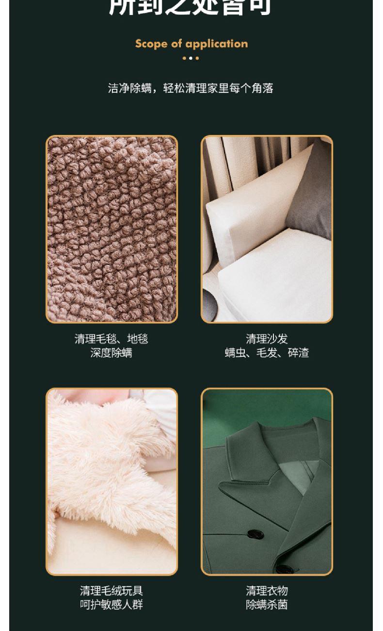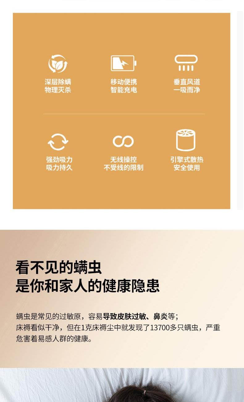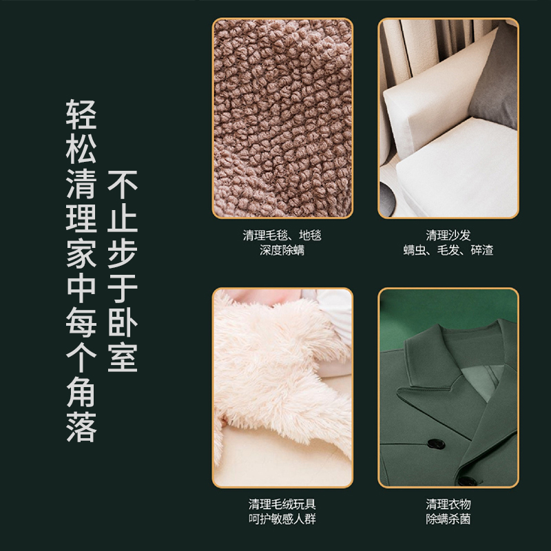 包装尺寸:295*230*150mm 外箱包装:785*295*485mm 包装材料:彩包 额定电压:7.4V~ 产品功率:50W 单台毛重:1.2kg 单台净重:0.9kg 无线操控,摆脱线的束缚 强劲吸力,吸力持久,深层除螨,物理灭杀 尘盒易拆洗,海帕过滤网可重复使用