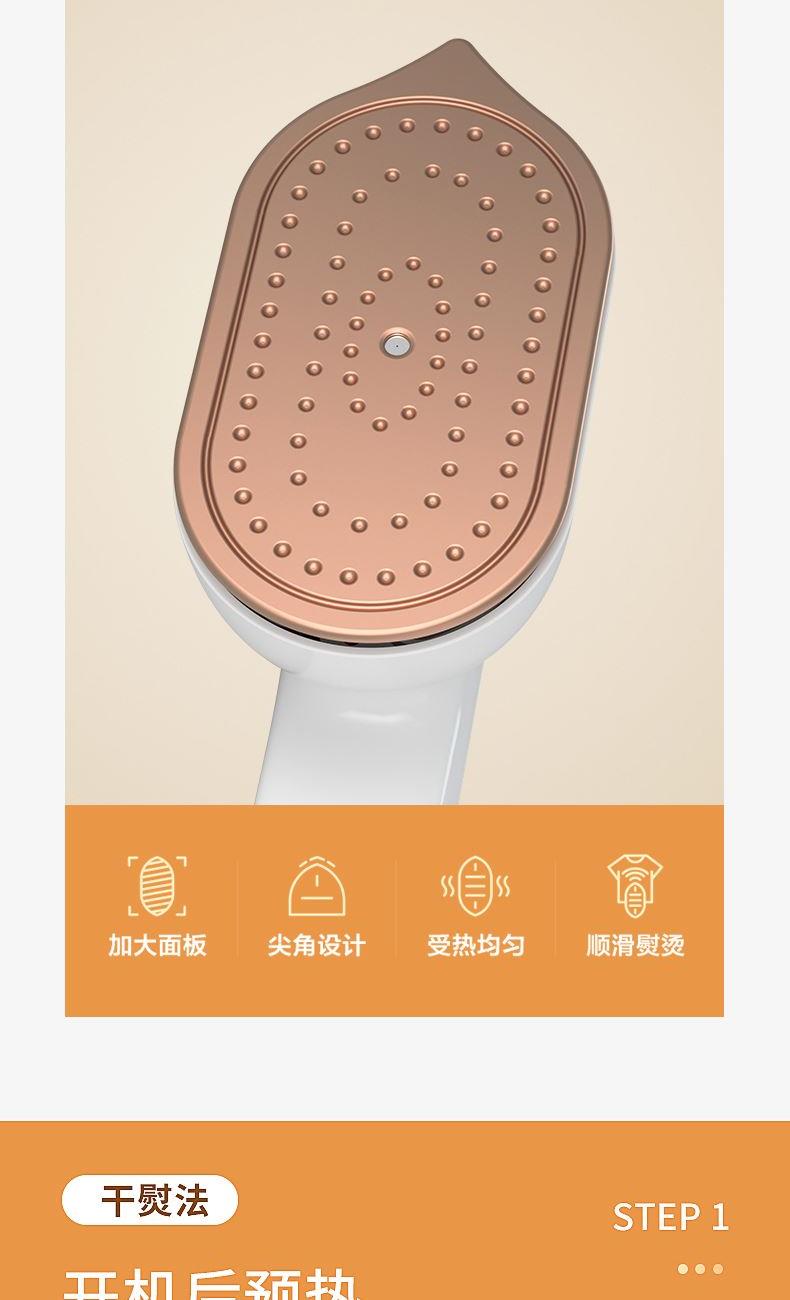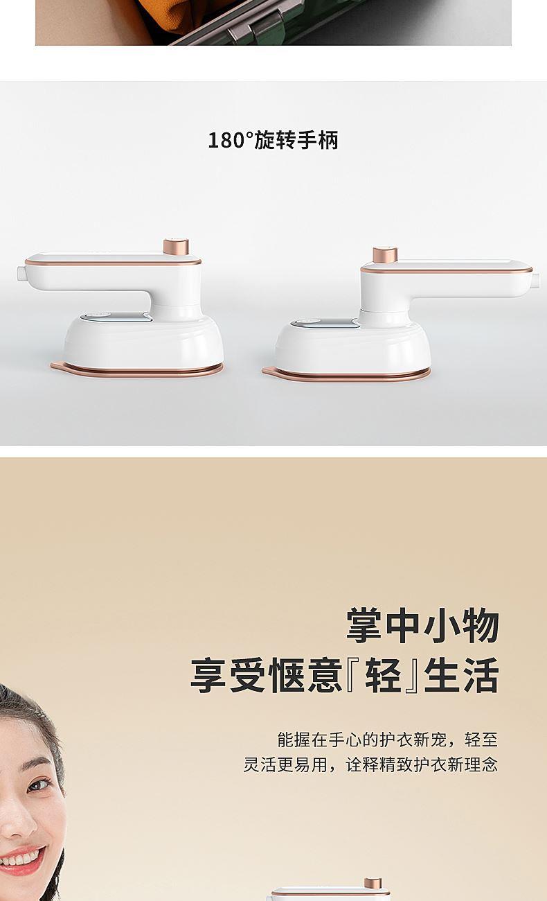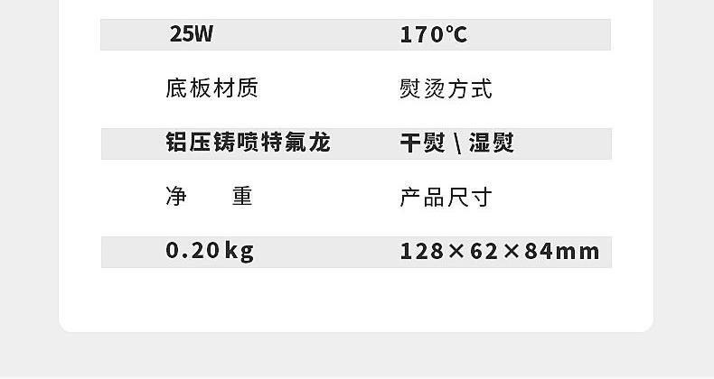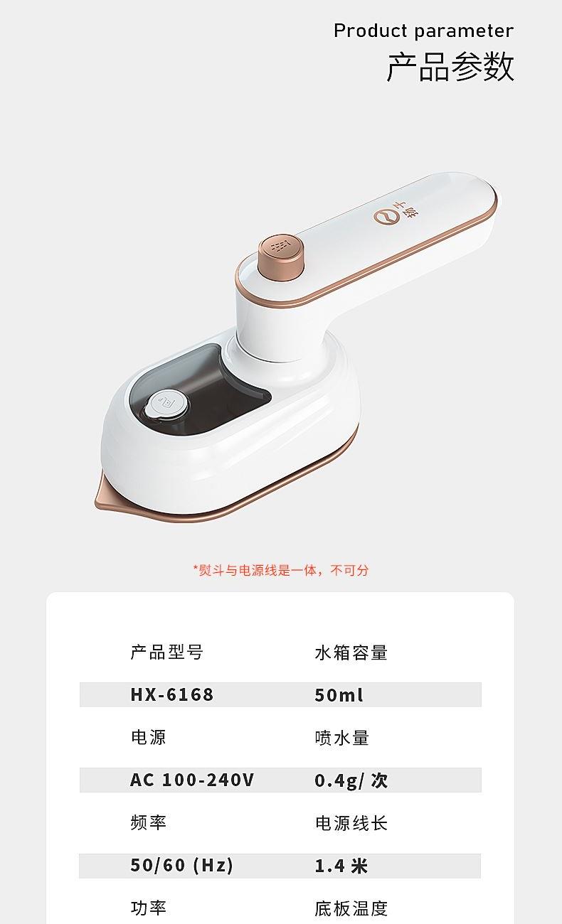 包装尺寸:165*105*105mm 外箱包装:530*335*530mm 包装材料:黄包 额定电压:220V~ 额定频率:50Hz 额定功率:25W 单台毛重:0.35kg 单台净重:0.2kg 旋转手柄方便使用 美人尖设计,快速加热,迅速除皱 细腻水雾,水润熨烫,干湿两用 嵌入式水箱快速简便加水