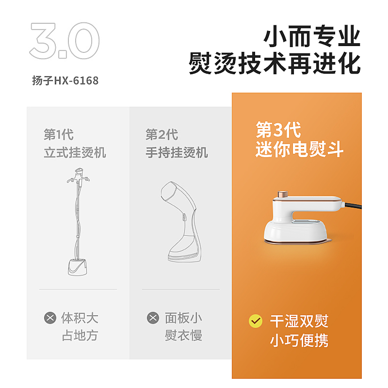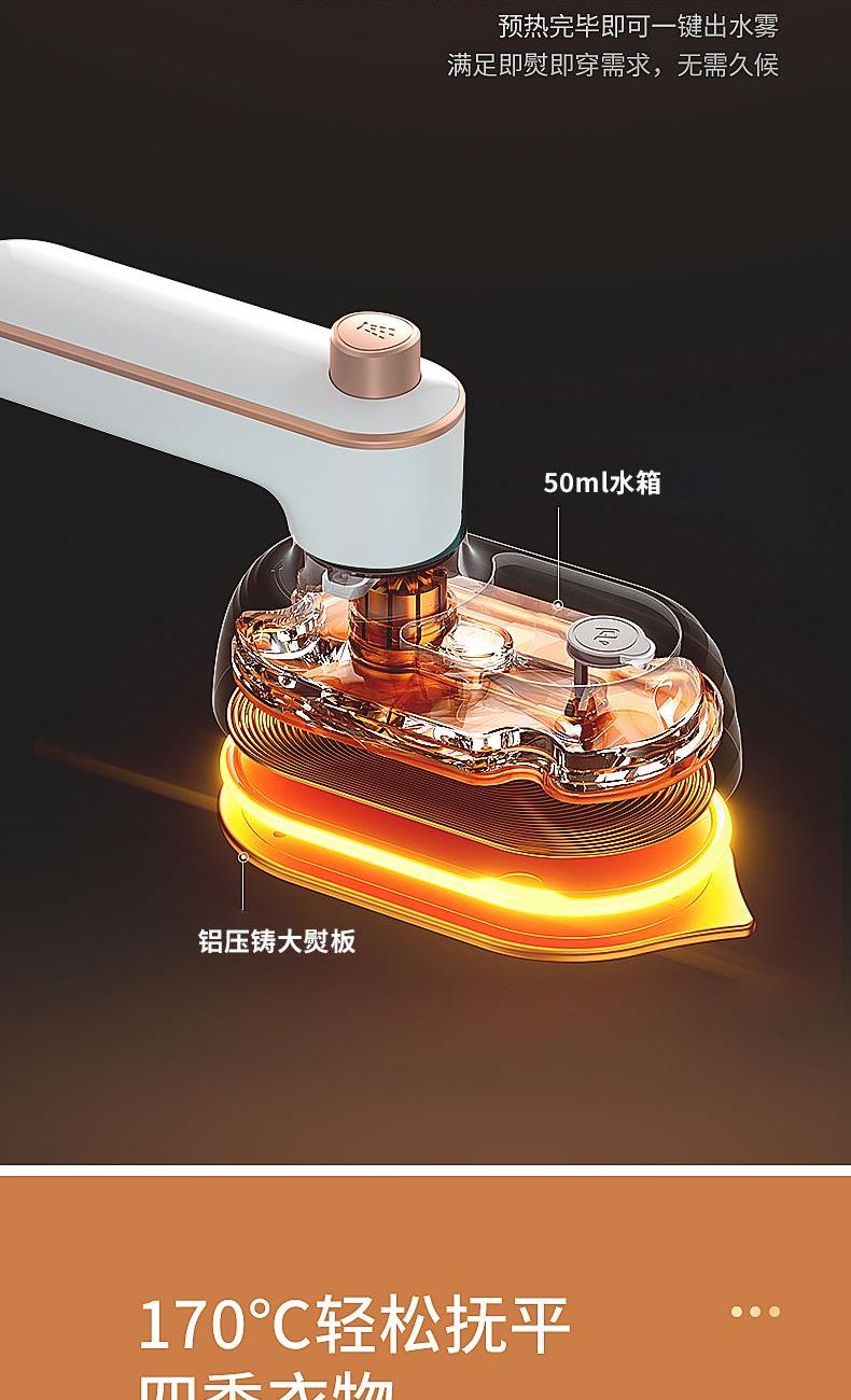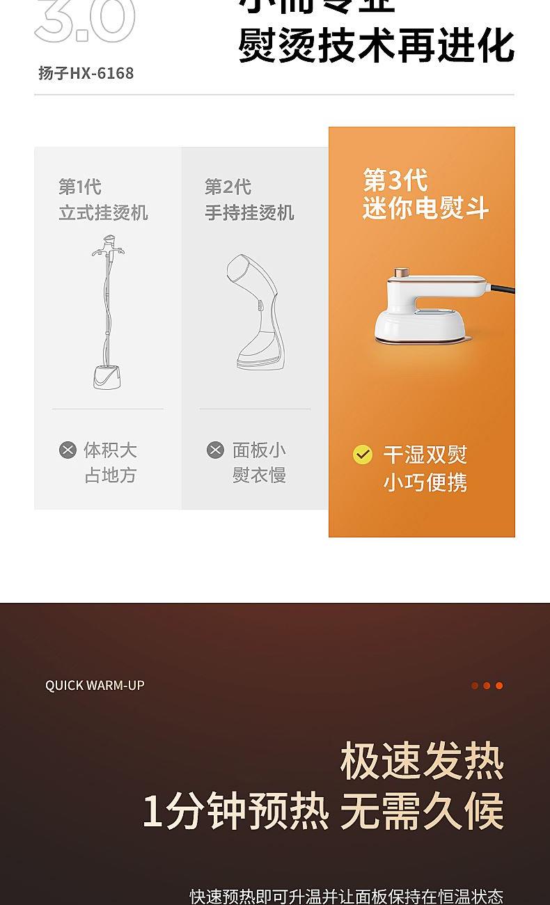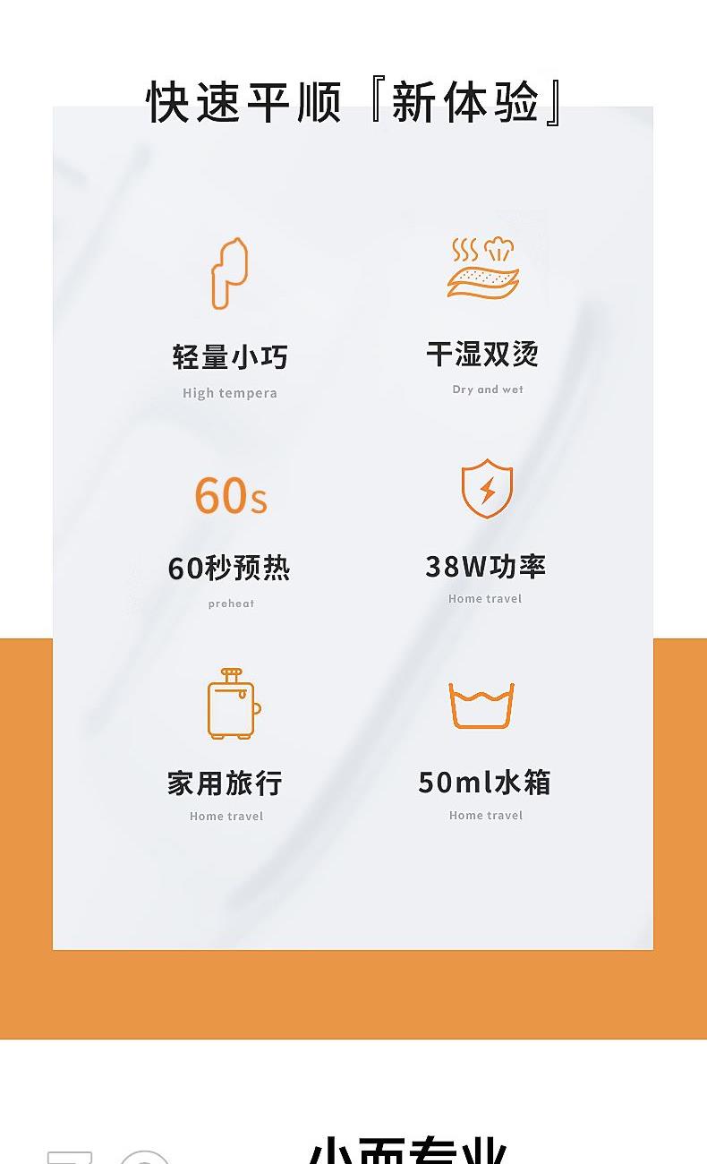 包装尺寸:165*105*105mm 外箱包装:530*335*530mm 包装材料:黄包 额定电压:220V~ 额定频率:50Hz 额定功率:25W 单台毛重:0.35kg 单台净重:0.2kg 旋转手柄方便使用 美人尖设计,快速加热,迅速除皱 细腻水雾,水润熨烫,干湿两用 嵌入式水箱快速简便加水