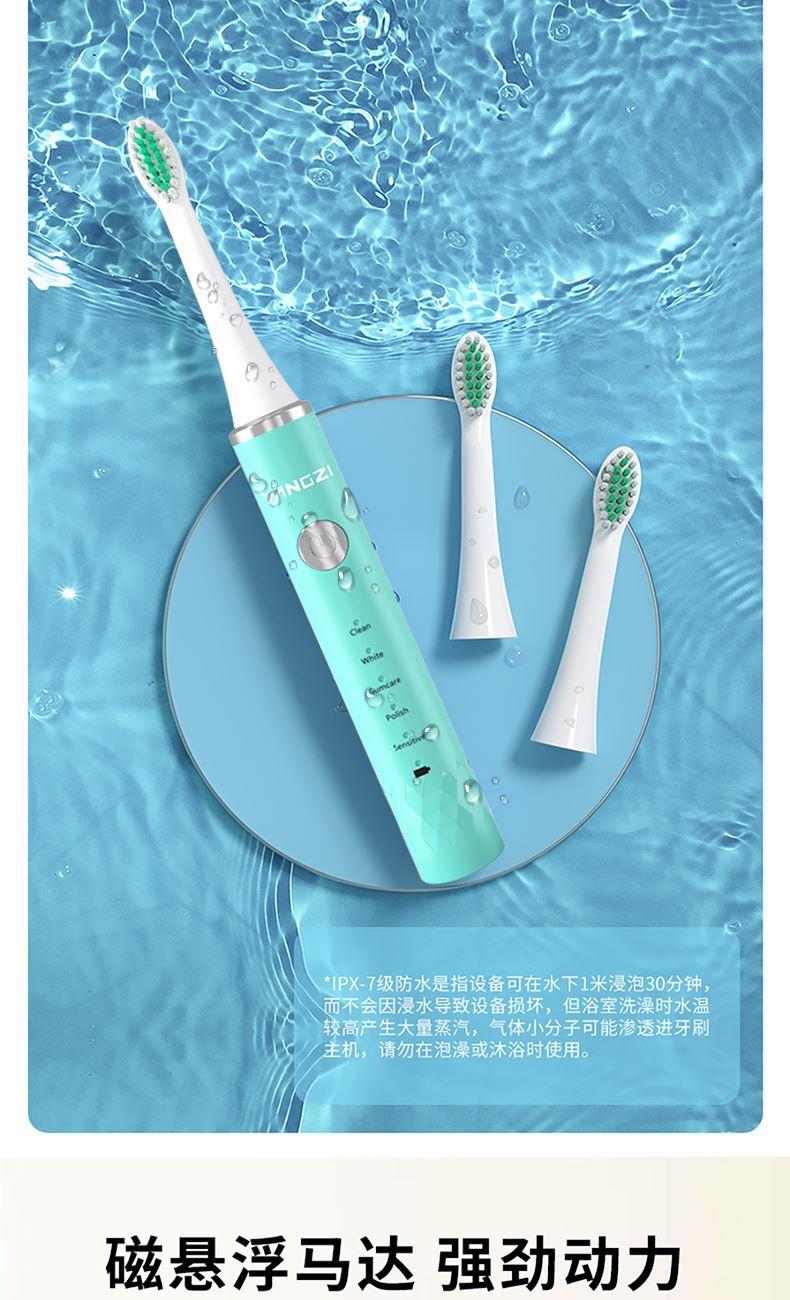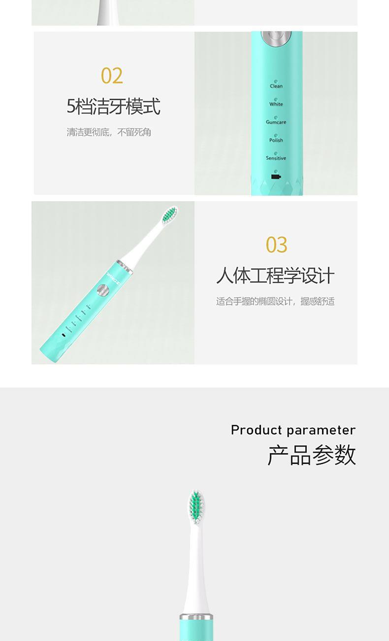包装尺寸:98*34*248mm 外箱包装:520*410*540mm 包装材料:彩包 额定电压:3.7V~ 产品功率:1W 单台毛重:0.2kg 单台净重:0.12kg 材 质:ABS 刷 头:3个 多重护理,5大清洁模式 智能定时,换区提醒 磁悬浮马达,强劲动力