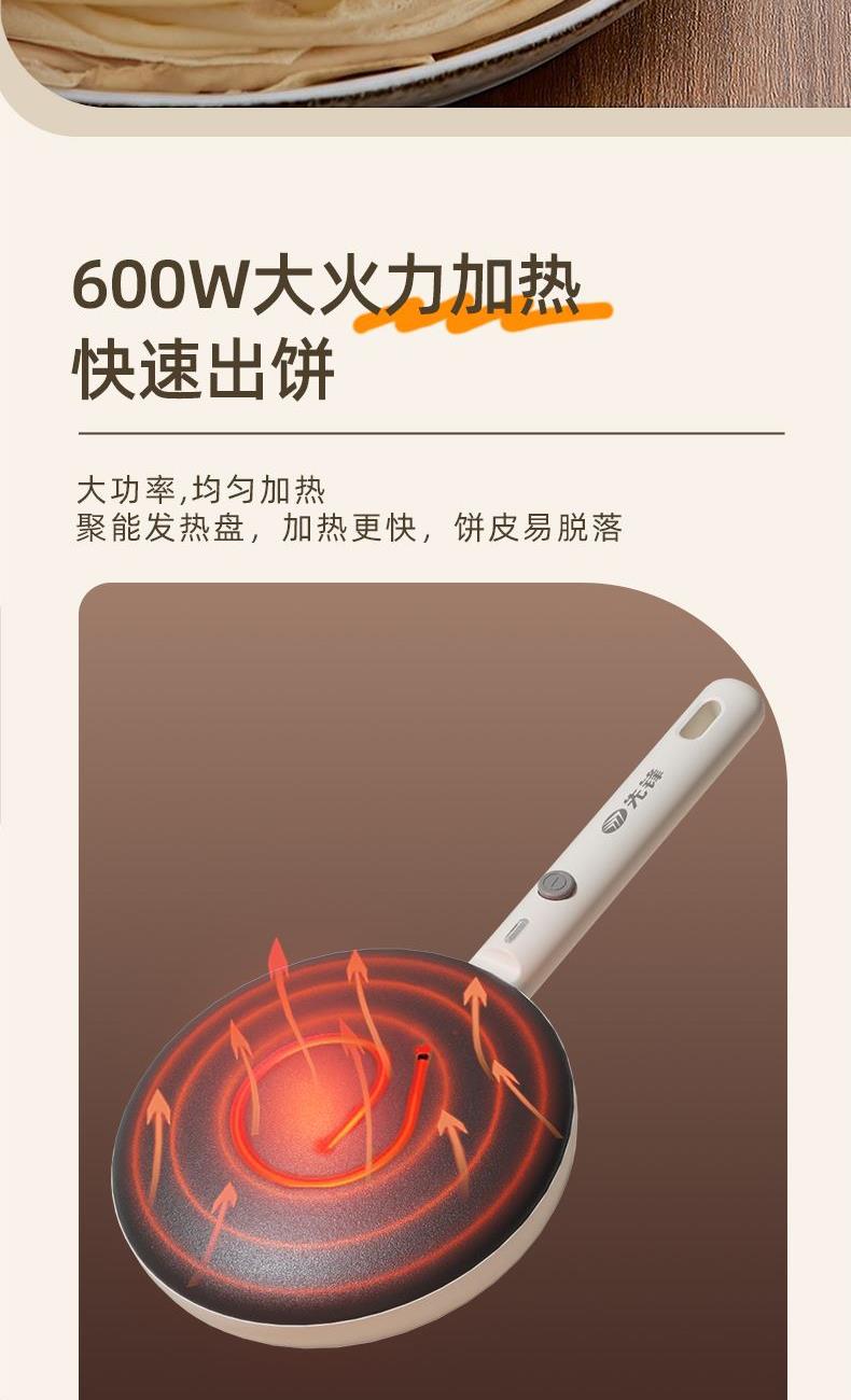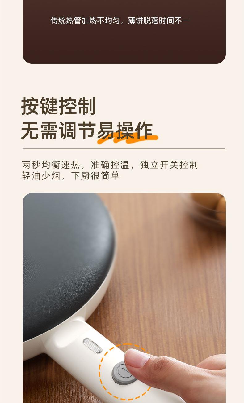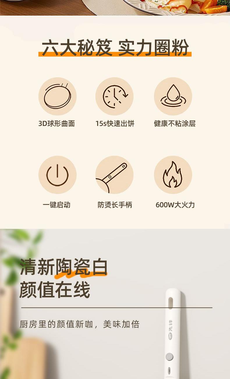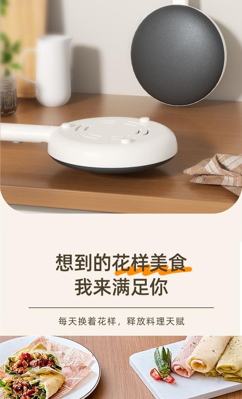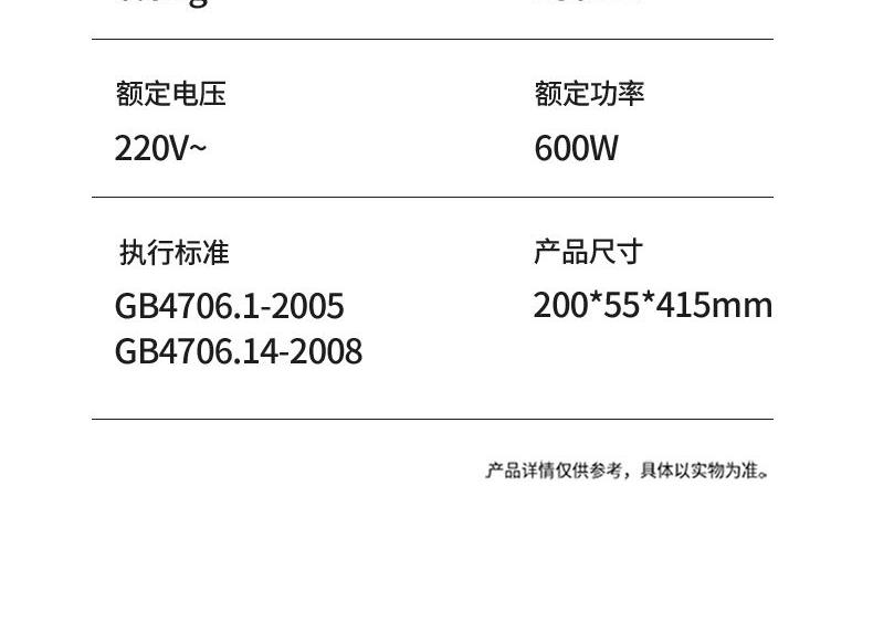 彩包尺寸:246*84*441mm 外包尺寸:510*445*460mm 单台毛重:1kg 单台净重:0.9kg 额定电压:220V 额定频率:50HZ 产品条码:6977197070670 包装材料:彩盒+外箱 功率:600W 食品级不粘涂层,均匀加热不粘不糊,底部散热口,快速散热,把手底部挂钩 方便收纳,工作灯设计 一键开关