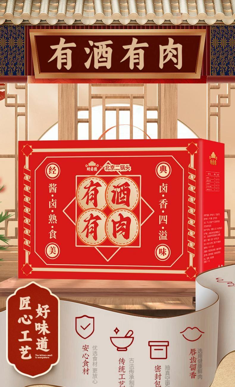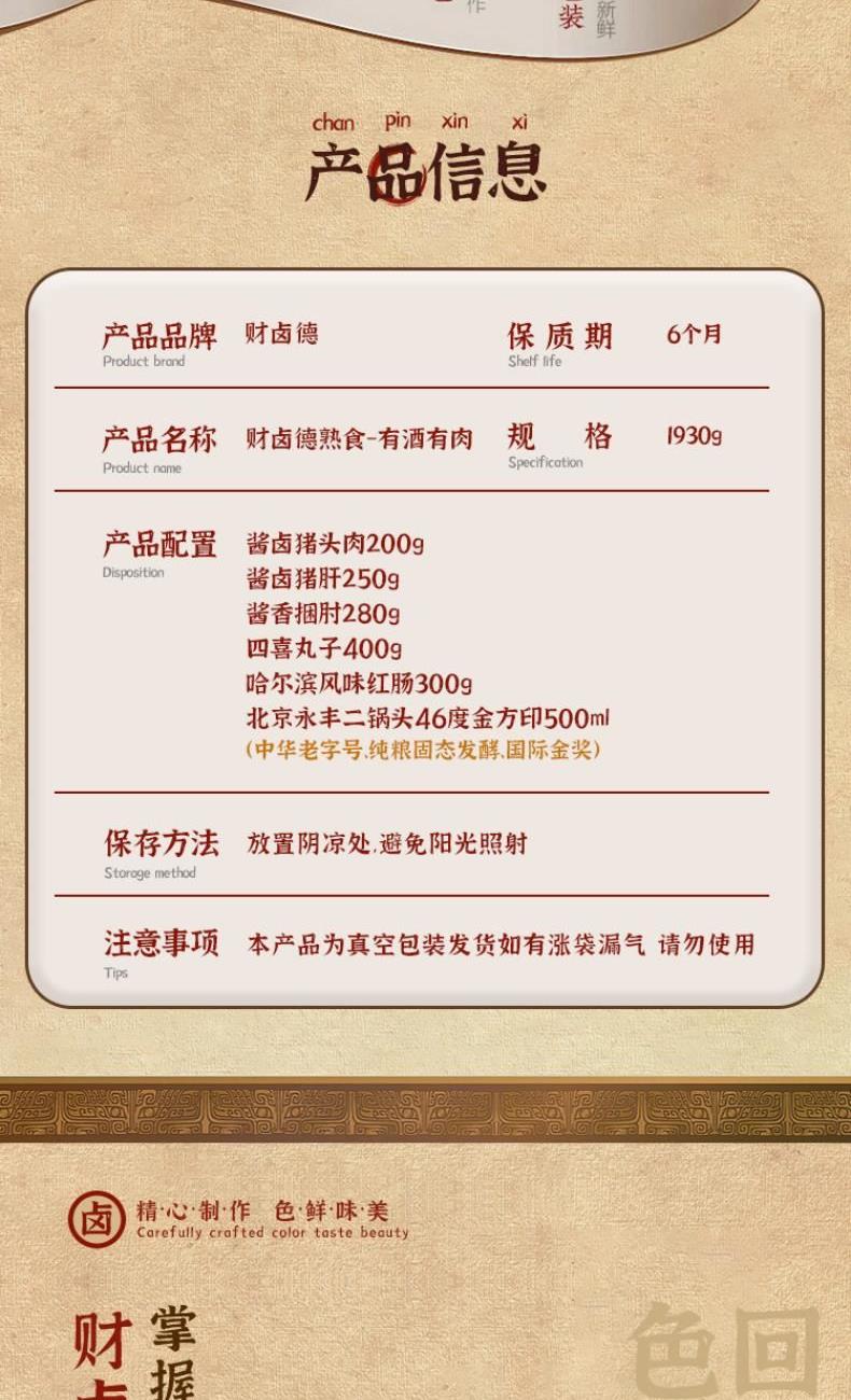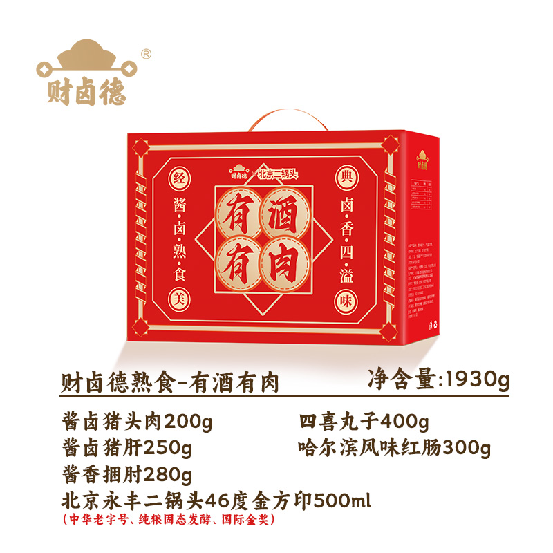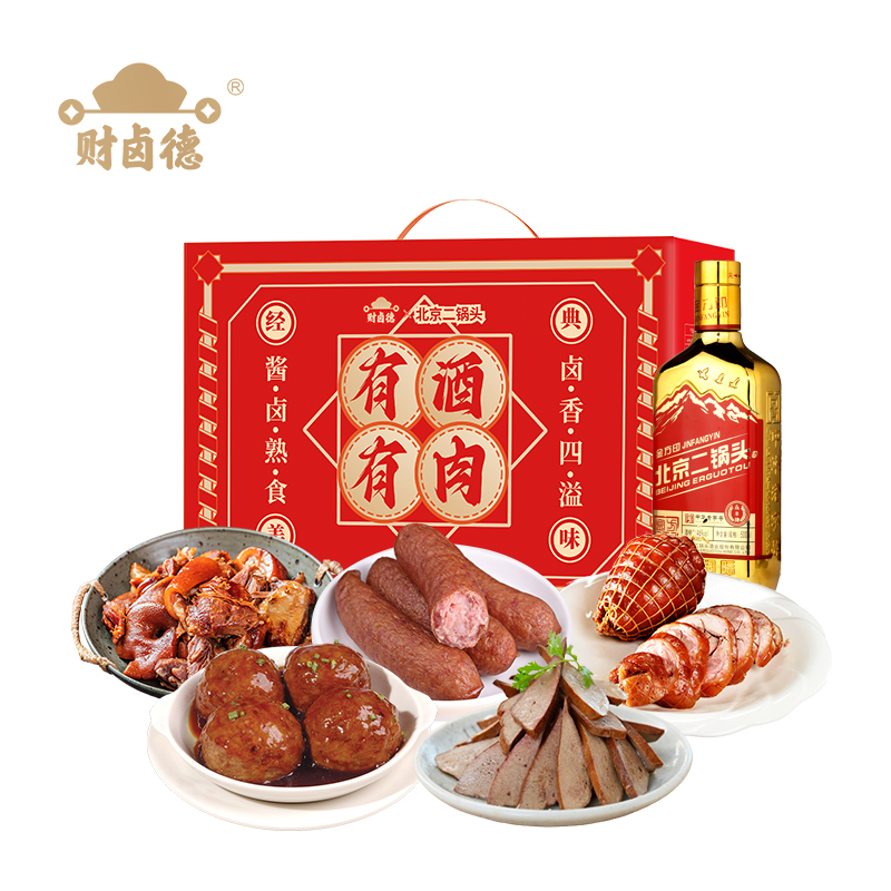 1.酱卤猪头肉200g 2.酱卤猪肝250g 3.酱香捆肘280g 4.四喜丸子400g 5.哈尔滨风味红肠300g 6.北京永丰二锅头46度金方印500ml (纯粮固态发酵、国际金奖)