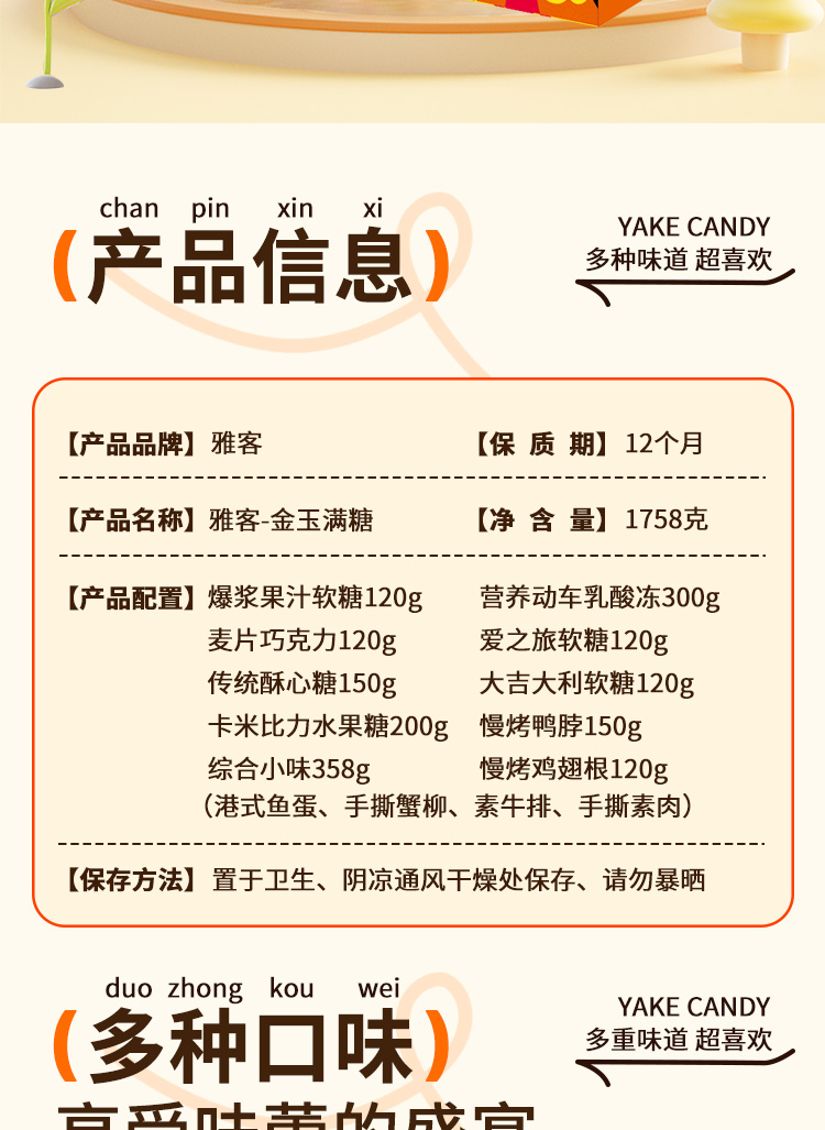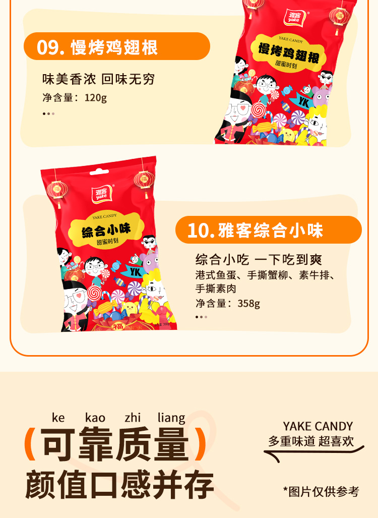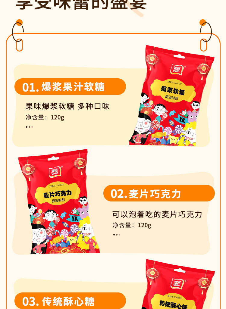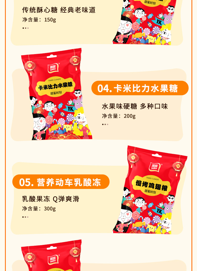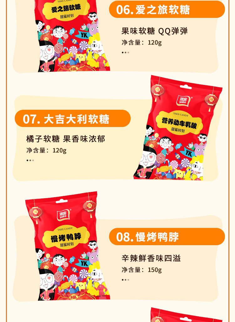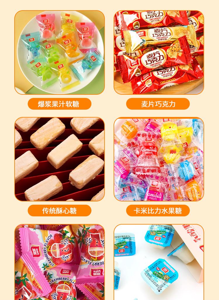 雅客V9爆浆夹心果汁软糖120g 雅客卜吉熊奶酪棒棒糖130g 雅客祝福满满软糖108g 雅客花初喜夹心棉花糖120g 雅客传统酥心糖150g 雅客卡米比力水果糖200g 雅客营养动车乳酸冻300g 雅客爱之旅软糖120g 雅客麦片巧克力120g 雅客财神到益生菌糖150g